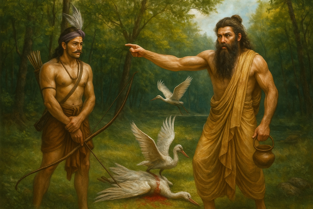 One day, as Valmiki walked through the forest near the Tamasa River, he witnessed a hunter shoot down a male krauncha bird while it was mating with its partner. The female bird cried out in grief, a sound so piercing and pure that Valmiki’s heart trembled. Overcome with sorrow, he uttered words that flowed out naturally: “Maa Nishada Pratishthaam Tvamagamah Shaashvateeh Samaah…” (“O hunter, may you never find peace for killing a bird in love.”) That spontaneous verse, born of compassion, became the world’s first shloka marking Valmiki as the Adi Kavi (first poet) and the Ramayana as the first poetic scripture in Sanskrit literature.