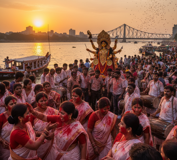 As the ritual concludes, the laughter slowly turns to tears. The sindoor-smeared faces now carry the weight of parting, as the Durga idol is carried away for immersion in the river (Visarjan). For Bengalis, this is an intensely emotional moment, a reminder of Durga as the daughter, visiting her parents for a few days and now returning to her marital home. The red of the sindoor, once joyous, now blends with moist eyes, symbolizing both victory (Vijaya Dashami) and separation.